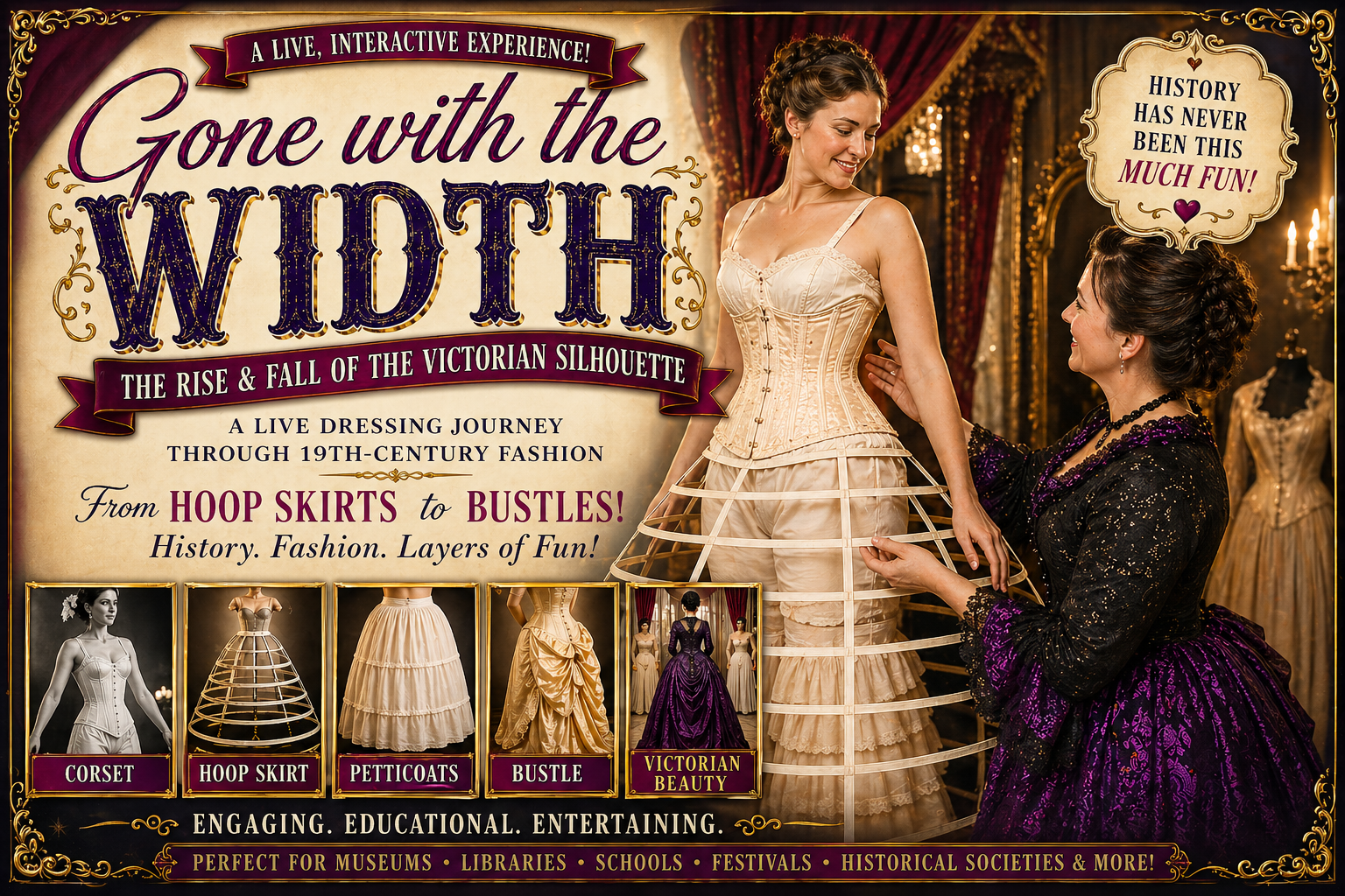 Travel back in time and watch history unfold—one layer at a time. Gone with the Width is a lively, interactive Victorian fashion experience where audiences witness the stunning transformation from hoop skirts to bustles in a live dressing demonstration that is as educational as it is entertaining.